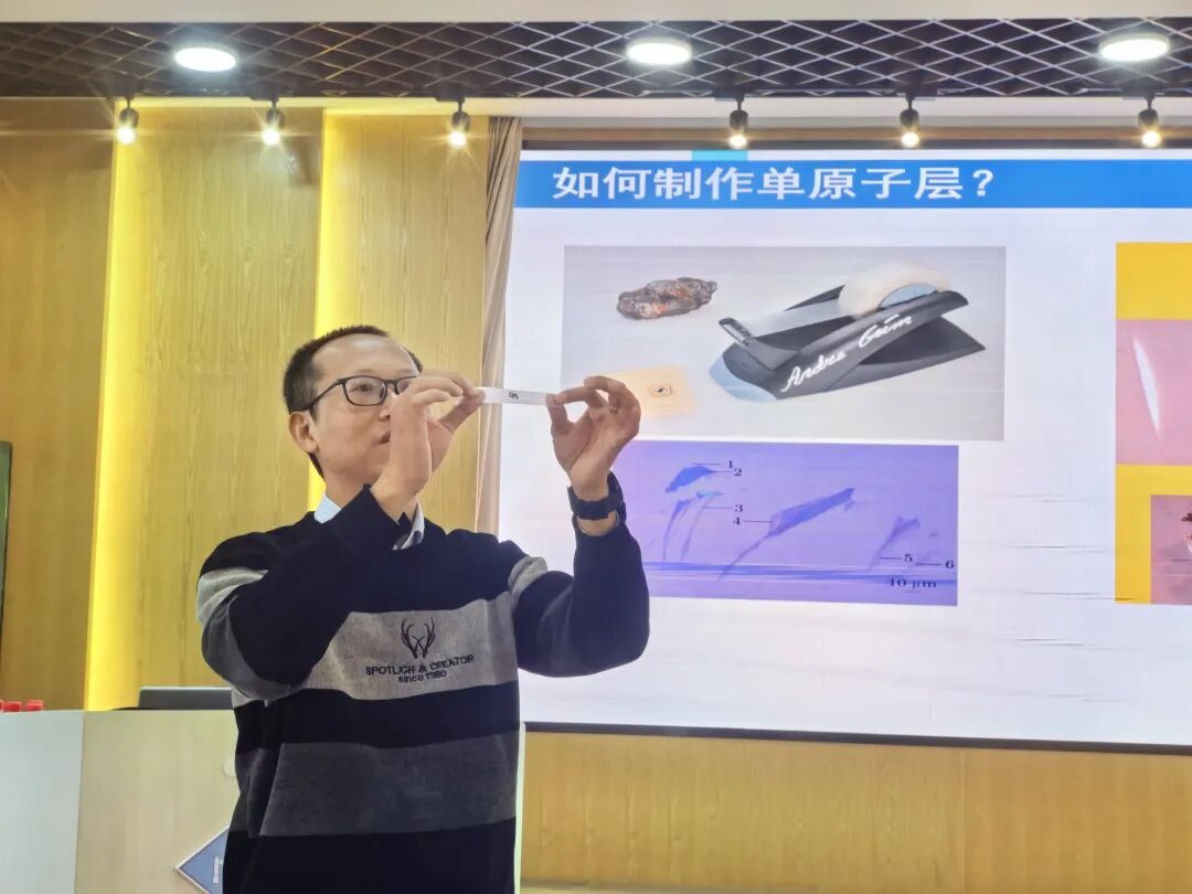 讲座后的互动环节更是将现场气氛推向高潮。谢教授携专业实验器材,现场指导同学们亲手体验“透明胶带法”制备单原子层石墨烯。这被誉为“最廉价的诺贝尔奖”级实验,让原本抽象的物理知识瞬间变得可触摸、可感知,在同学们的惊叹与实践中,焕发出迷人的光彩。